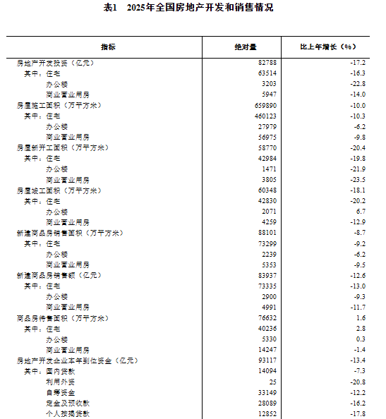 2025年,全国房地产开发投资82788亿元,比上年下降17.2%(按可比口径计算,详见附注6);其中,住宅投资63514亿元,下降16.3%。